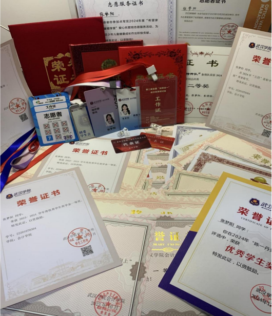 【人物名片】张梦阳,财务管理2203班班长兼团支部书记,现任会计学院团委学生副书记,曾任会计学院23级朋辈导师、武汉学院心理健康教育中心助教。学业成绩优异,综测专业第一,平均绩点4.19,位居专业前列。在校期间屡获荣誉,连续两年荣获“优秀学生”一等奖学金,获得2024年陈一丹奖教奖学金“优秀学生奖”,获评优秀共青团干部,所带班级荣获“先进班集体”称号,所在宿舍连续两年被评为校级文明宿舍和院级文明宿舍。