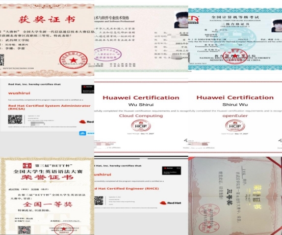 没有应届生身份加持,也未完成全部学业,他的突围凭借的是一套扎实的“实践方法论”。大学几年来,他考取了HCIP-Cloud Computing、RedHat-RHCE、国家软考中级网络工程师等10余项高含金量专业证书,揽获3项省级奖项、2项校级奖项,发表软著1篇,并参与青山红卫社区等8个社会实践项目。