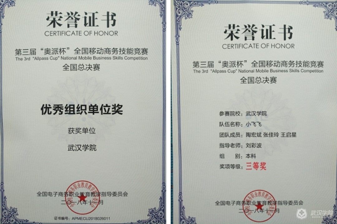 2018年11月25日,第三届“奥派杯”全国移动商务技能竞赛全国总决赛在江苏常州开赛,我校工商管理系电子商务专业“小飞飞”团队在比赛中获得三等奖,我校获得优秀组织单位奖。
