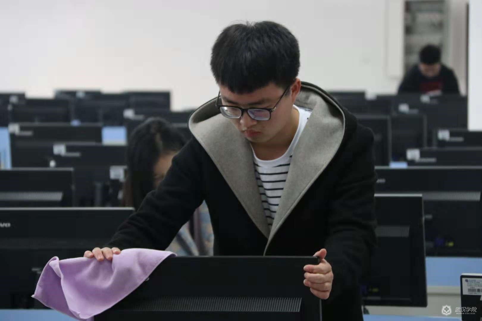 活动开始时,团学联干事将活动所需的清洁用具搬到马化腾教学楼下。活动负责人介绍完分组情况与机房清洁具体要求后,活动参与者逐一领取清洁用具,随后便前往负责的机房,着手完成义务清洁任务。随后,同学们认真负责、细致耐心地清扫机房。