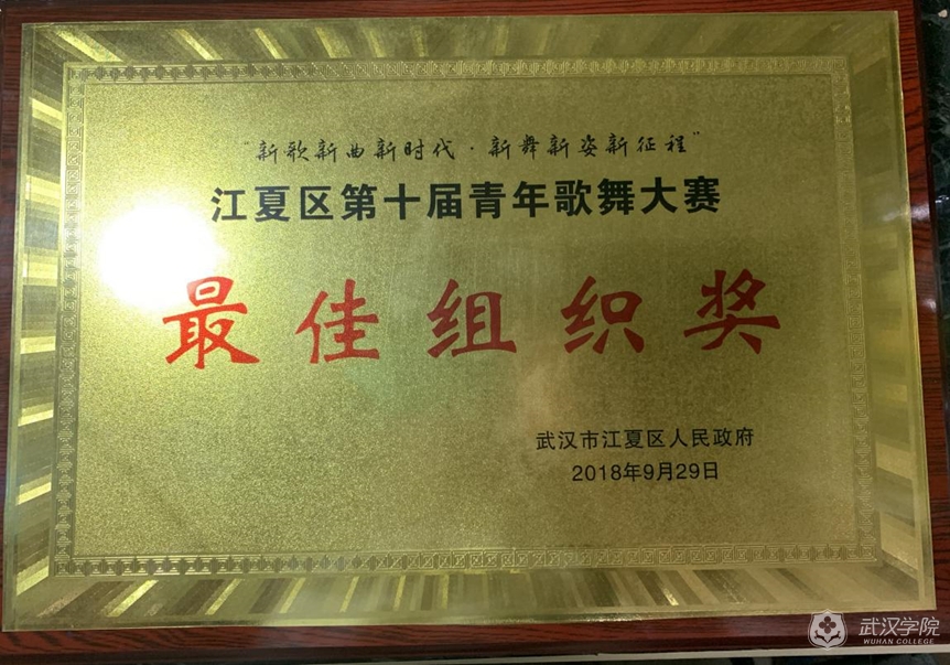 2018年9月29日,江夏区第十届青年歌舞大赛颁奖晚会于江夏区体育馆举行,我校荣获大赛最佳组织奖。颁奖晚会上,我校大学生艺术团舞蹈队表演的民族舞蹈《一抹红》受邀参加公演。