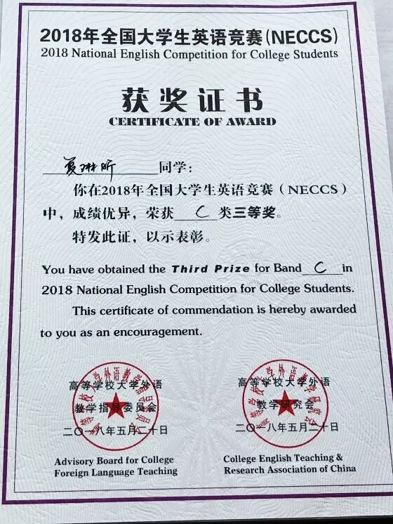近日,全国大学生英语竞赛(NECCS)获奖名单公布,传播系大楚1601班张渝获得C类二等奖、大楚1601班陈宇萱和网络与新媒体1701班夏琳晞获得C类三等奖。