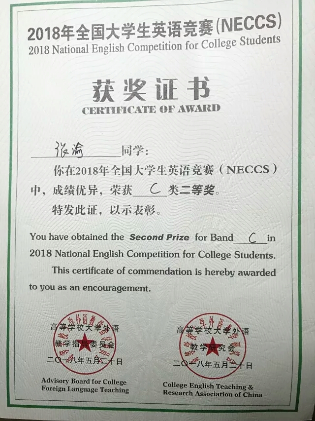 张渝的英语成绩一直名列前茅,英语竞赛临近时,为了给自己良好的学习环境,周末一整天呆在图书馆里刷题成为了她的生活常态。去年张渝取得的是同类三等奖,这次她同时报名了英语四级和大学生英语竞赛,“我把它当作一次考试,不管结果怎样都是对自己的一次考验,从准备的过程中可以锻炼自己的能力,结果或许重要,但更重要的是在准备的过程中有所提升。”对于自己获奖,张渝表示,题目的积累很重要,“量变产生质变”,她建议有意参加比赛的同学应提早准备,训练听力并一直坚持下来。