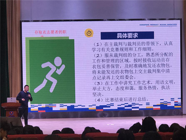 “本次的志愿者培训大会只要涉及存取衣服务,这是整场马拉松赛事中最最重要的环节,没有之一。”大会一开始,上台的宣讲人武汉马拉松志愿者主管王梓桐便向在场的武院学子阐明了此次培训会的重要性。“存取衣服务工作量很大。一共24000名参赛者,总服务人群为16000人。”