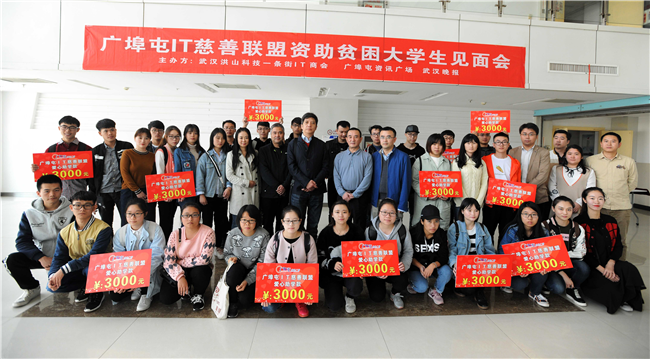 据悉,此次活动是由洪山区科技和经济信息化局、洪山区政府珞南街办事处、武汉洪山科技一条街IT商会以及广埠屯资讯广场、武汉晚报联合发起由广埠屯IT慈善联盟组织实施的一项以特困大学生为帮扶对象的社会公益活动。