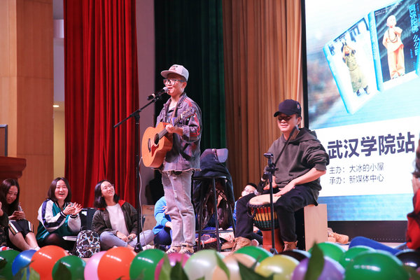 10月17日18:30,马化腾教学楼2102报告厅热闹非凡,由著名作家大冰为读者提供的免费“售后服务”——百城百校音乐会,再次来到武汉学院,大冰的小屋两位歌手再度背上吉他行遍天涯,代替大冰来问候武汉学院的广大学子,用歌声讲诉故事,吸引了现场500余人。