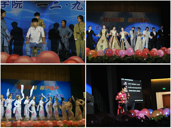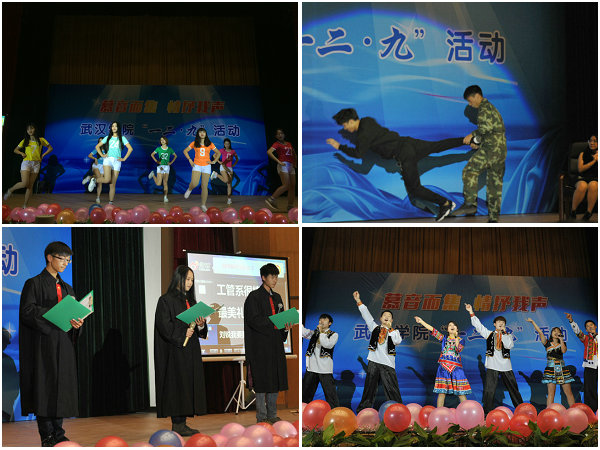 伴随着活力四射的开场舞,活动正式拉开序幕。首先出场的是由工商管理系带来的情景剧《武院梦想秀》,诙谐的语言,夸张的肢体动作,给现场带来阵阵笑声;法律系的诗朗诵展示了青年学子蓬勃的生气;信息及传播学院的歌舞表演《一想到你啊》,动听的歌曲与青春洋溢的舞蹈结合,给观众带来美的视听盛宴;广播台带来的配音情景剧表演,优秀的剧本、合适的演员配上精湛的表演获得现场师生一致好评;外语系别具风采的英语话剧《MY FAIR LADY》通过标准的英文和深情的演艺为观众再现了经典的爱情片断;艺术设计系的歌舞情景剧《LUVME》带大家回到了念念不忘的青葱校园时光;会计及金融学院的舞蹈《采薇》古典的服饰配以优美的舞姿让现场观众眼前一亮。钢琴与二胡的独奏给整场活动画上圆满句号。
