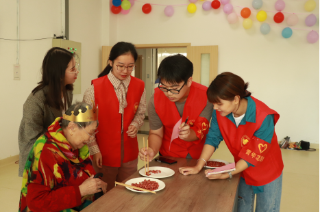 10月19日9:00,20多名武汉学院志愿者走进洪山区福利院,为寿星老人们庆生,举办生日会,给该院40多名老人带去欢声笑语,送去温暖。