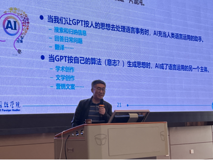 随后胡惮教授对GPT对语言生活的影响进行了深入的阐释,并结合实例,呈现了在GPT影响下语言生活新变局。胡教授结合语言生活中的实际问题,比较分析主流GPT给出的回答,认为当下GPT在运用、学习与研究三个维度对语言、语言知识、语言技术等方面(共九个细分范畴)有着很强的应用性和广阔的发展前景。最后,胡教授就Chat GPT带来的机遇、风险与应对策略与大家进行了探讨。胡教授分析了语言智能技术当下面临的伦理困局。同时,也对技术层面的滥用、垄断及失控相关问题表示关切,指出要集教育、立法与研究多方力量制定有序有限使用策略。
