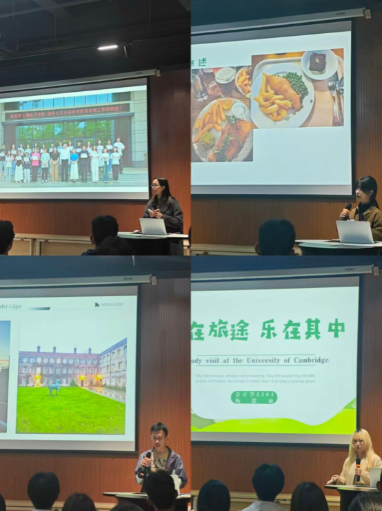 三位参与访学的同学从不同角度分享了他们的收获。英语2304班徐丽娜系统介绍了研学目的、行程安排与注意事项;工程2301班刘泽毅通过精美的照片,带领大家云游剑桥的名胜古迹;会计学2304班杨思雨则从衣食住等生活细节入手,分享了实用的海外生活经验。多元的视角让同学们对访学生活有了更立体的认知。通过真实的课堂案例、丰富的文化见闻和深刻的个人感悟,让在场同学深切感受到了世界顶尖学府的学术氛围和海外学习的独特价值,引发了同学们的浓厚兴趣和热烈反响。