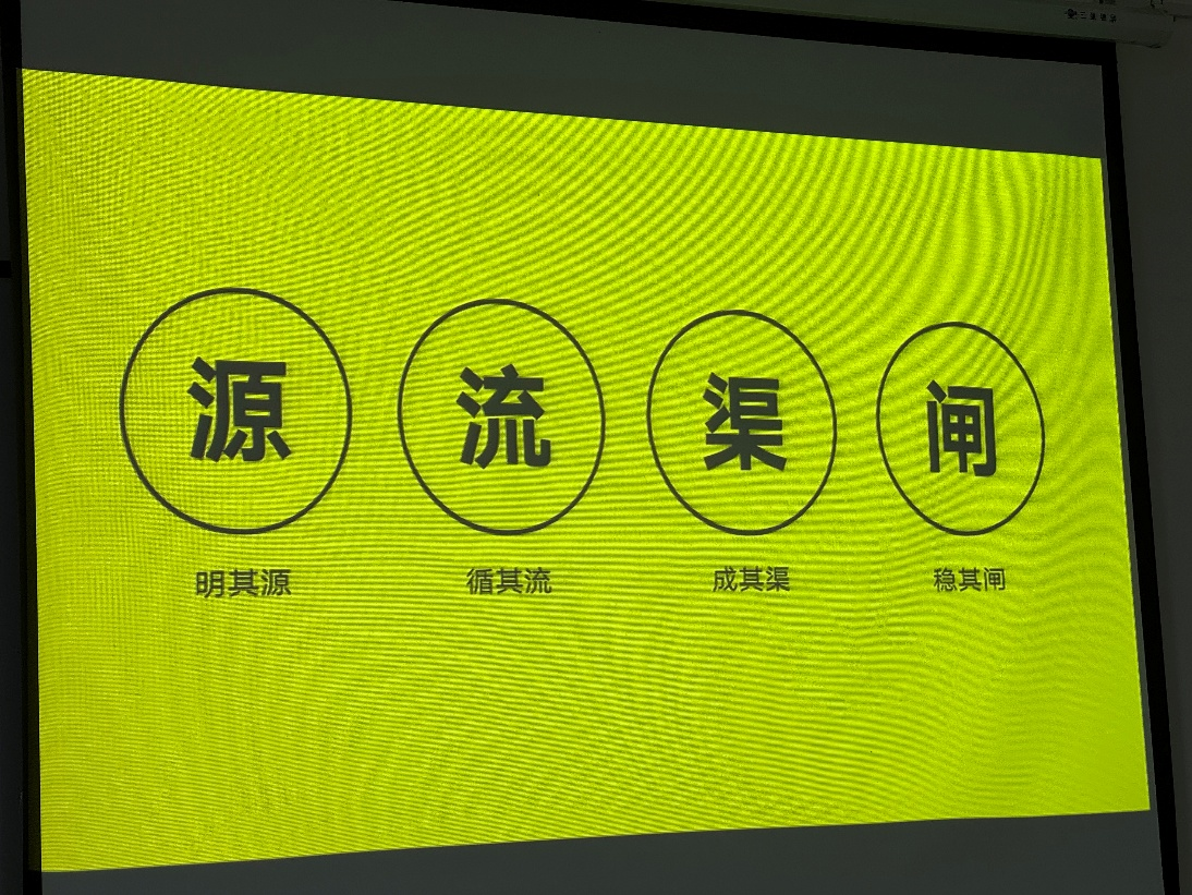 随后,张俊杰以一张“设计师与AI共舞”的动态海报切入,抛出一个引发深思的核心问题:“当AI能在10秒内生成100张图时,我们的学习价值何在?”他随即给出答案:关键在于培养 “Design as System” 的系统思维,并首次公开发布了其个人教研成果——“源·流·渠·闸”四步闭环模型,为现场师生提供了可操作的方法论指导。