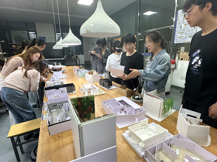 此次展览环境设计专业组织跨年级学生现场学习,低年级学生在教师带领下分析模型结构,高年级创作者则驻场分享设计思路。同时专业教师团队对作品进行现场评分,重点考察材料运用合理性和空间表现力。有学生表示:“亲手调试激光切割参数的经历,让我们对课堂理论有了更深刻的理解。”