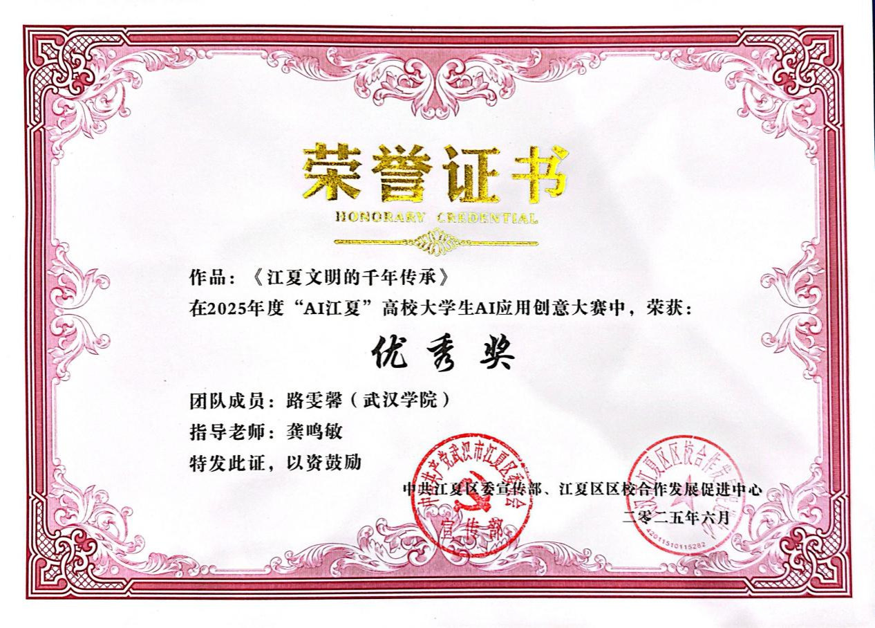2025年“AI江夏”高校大学生AI应用视频创意大赛获奖名单近日揭晓,由我校信息工程学院学生路雯馨创作,信息工程学院教师龚鸣敏指导的AI视频作品《江夏文明的千年传承》,从来自全国20余所高校的300余件参赛作品中脱颖而出,荣获优秀奖,龚鸣敏获“优秀指导老师奖”,学校获“优秀组织奖”。