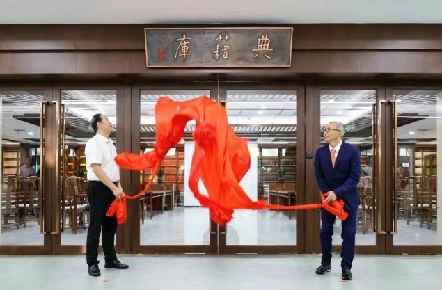 同日揭幕的“典籍库”位于陈一丹伉俪图书馆七楼。库内悬挂国学泰斗饶宗颐先生题写的匾额,收藏由陈一丹先生捐资购置的5200余册(套)典籍,是华中地区民办高校规模最大的典籍收藏中心。馆藏包括《文津阁四库全书》《永乐大典(辑佚本)》《儒藏》等重要典籍,1904—1948年全套《东方杂志》影印本,以及《湖北通志》《荆楚文库》等地方文献系统收藏。“典籍库”集古籍阅览、学术研讨、文化展览于一体,将依托数字校园建成“荆楚文化典籍数据库”,并常态化举办“典籍中的中国”展览及古籍修复体验课。