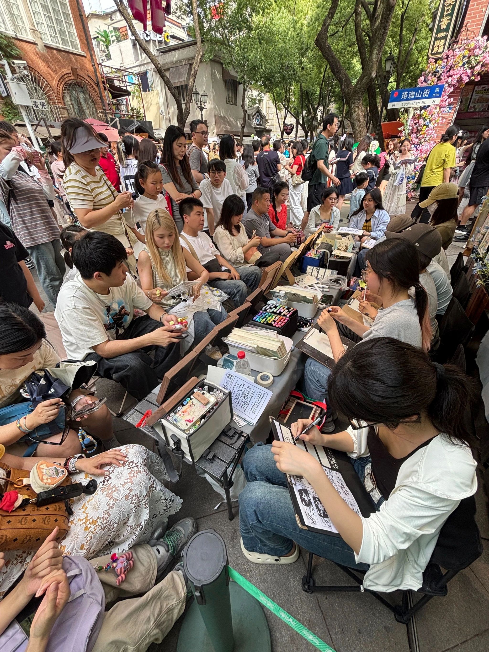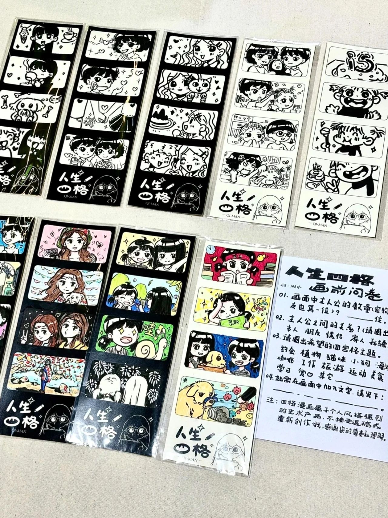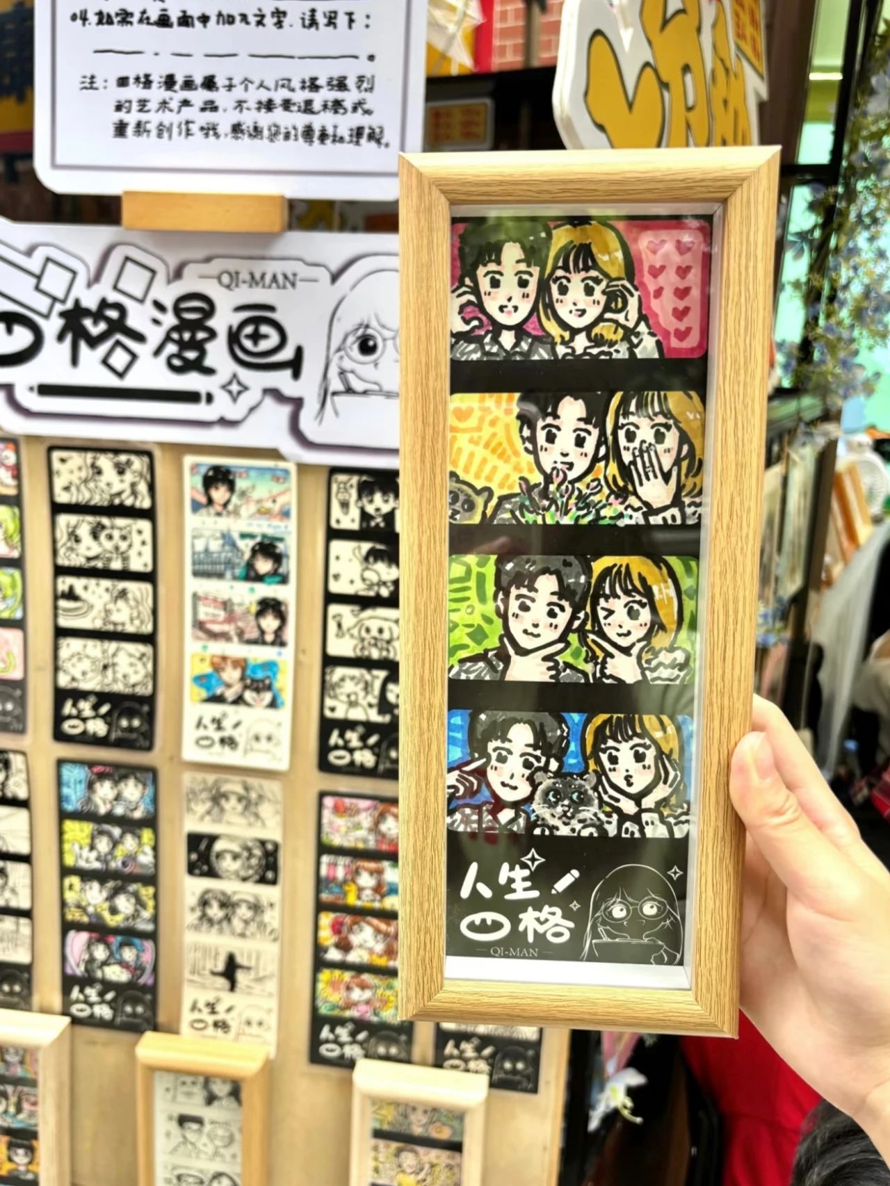 “人生四格”漫画根据画作复杂程度,定价为58元至98元。画师们通常在周末出摊,日收入在200至300元。遇上节假日,生意火爆时,日收入可达500至800元。今年五一假期,顾客流量达到峰值,单日接待量突破500人次。