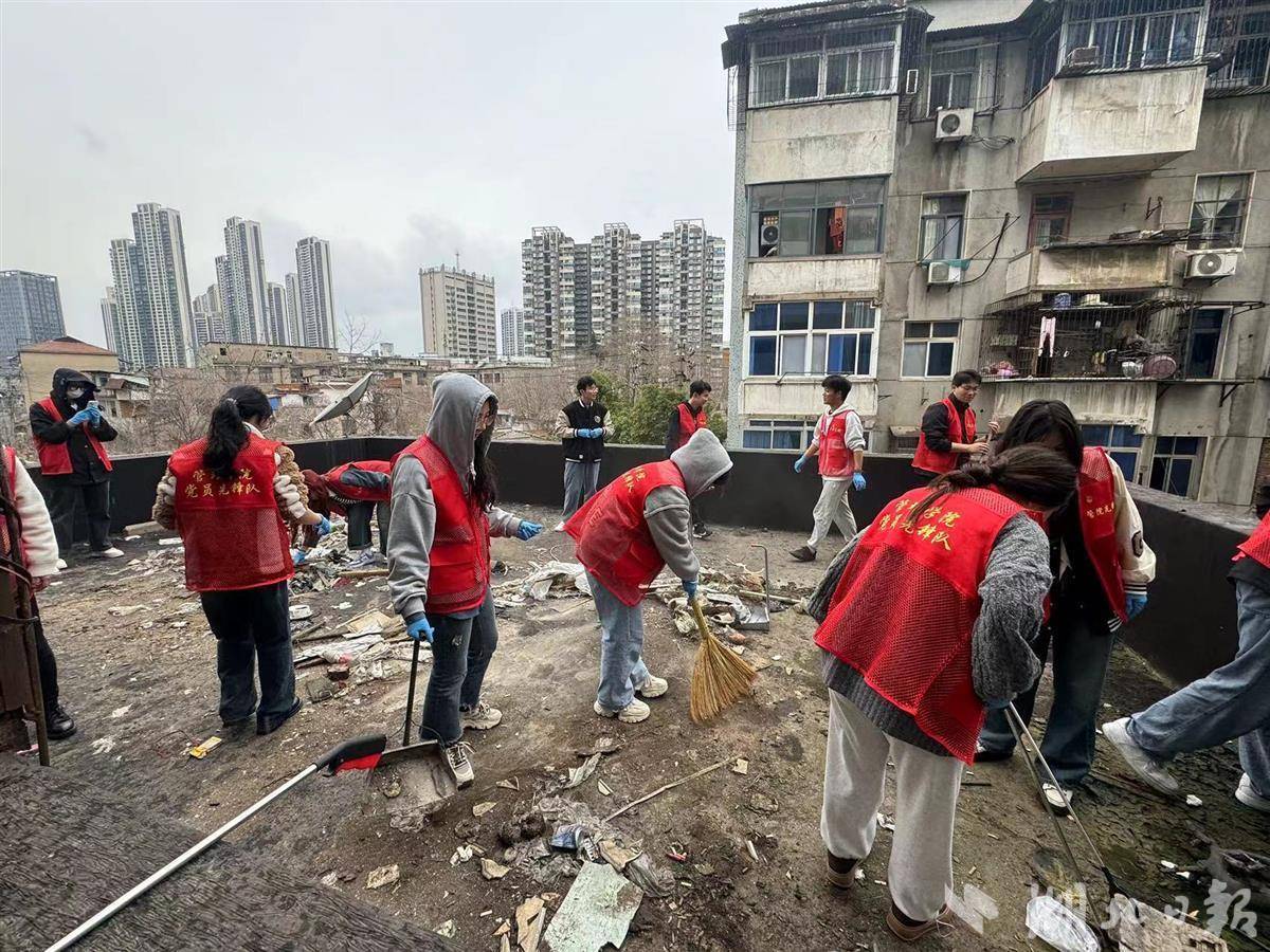 武汉学院管理学院清洁家园党员先锋队则对小区房前屋后的屋顶、屋檐沉积的垃圾进行清扫,对烟头枯草、墙角边缝等卫生死角进行大扫除。经过一个半小时的清理,辖区内被打扫得干干净净,环境焕然一新。