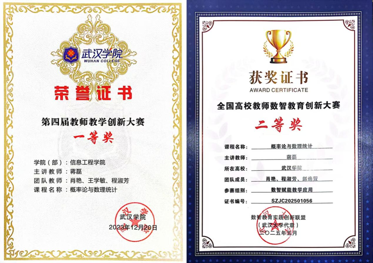 教学相长,蒋磊老师在不断改革创新的同时也收获了一些荣誉,2023年荣获校第四届教学创新大赛一等奖,2025年,他又带领团队参加首届全国高校教师数智教育创新大赛,荣获二等奖。他主持的校级重点教研项目《数智赋能混合式教学模式创新研究——以应用型本科数学教学为例》,致力于将数智技术与传统教学深度融合,为教学改革注入新活力。他还将思政元素融入课程,主持《概率论与数理统计》曾获校级课程思政示范项目、省级一流课程认定,真正实现了知识传授与价值引领的有机统一。
