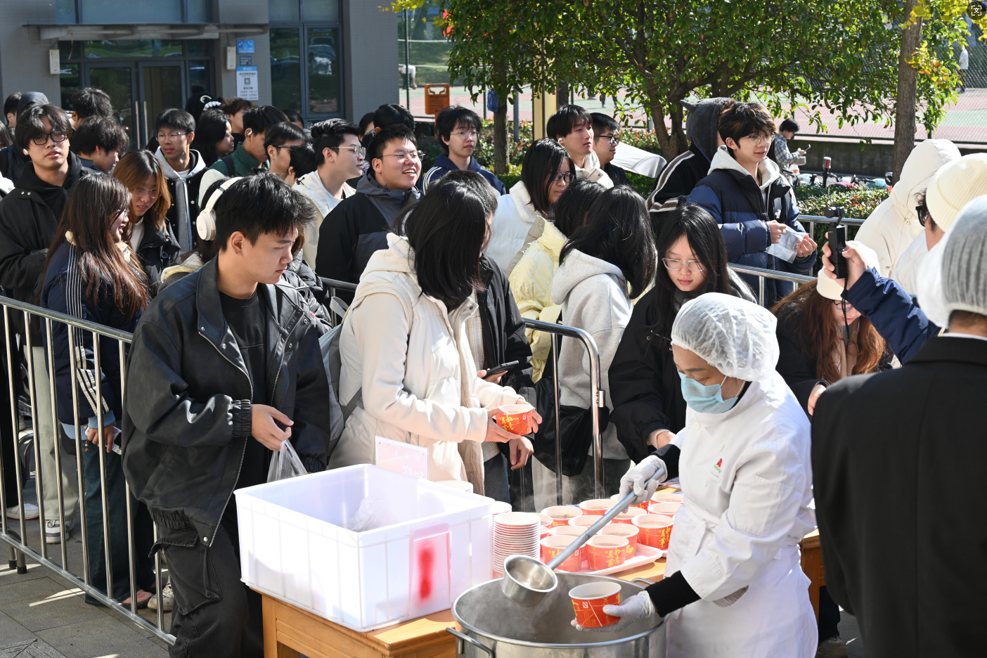 “去年没吃到,今年特意提前过来排队!”一位正在品尝烤全羊的同学兴奋地说。活动现场,香气四溢的烤全羊和温暖滋补的藕汤成为现场最受瞩目的“重磅美食”,师生们手捧热腾腾的藕汤,在初冬时节感受到浓浓暖意。现场还设有趣味游戏互动区。同学们通过参与“说反话”“指东看西”等小游戏赢取抽奖与套圈机会,现场笑声不断,气氛热烈。