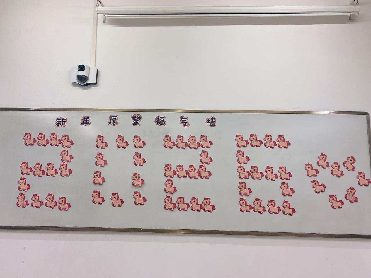 教室白板上由61张小马造型心愿卡拼组而成的“2026”新年愿望福气墙,成为全场焦点。同学们在卡片正面写下新学期目标:“希望四级顺利通关”“争取专业排名前进5名”……这些心愿错落拼搭,既象征着丙午马年的奋蹄之意,也寓意着61名同学携手启程。