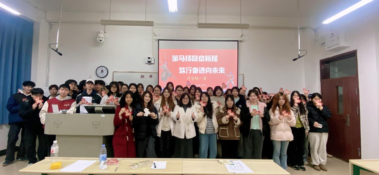 3月8日晚,艺术与传媒学院新闻学专业61名同学在“开学第一课”主题班会上,用61张小马造型心愿卡拼出“2026”福气墙,并在辅导员李莹老师准备的“惊喜盲盒”中,开启了温馨而励志的新学期。