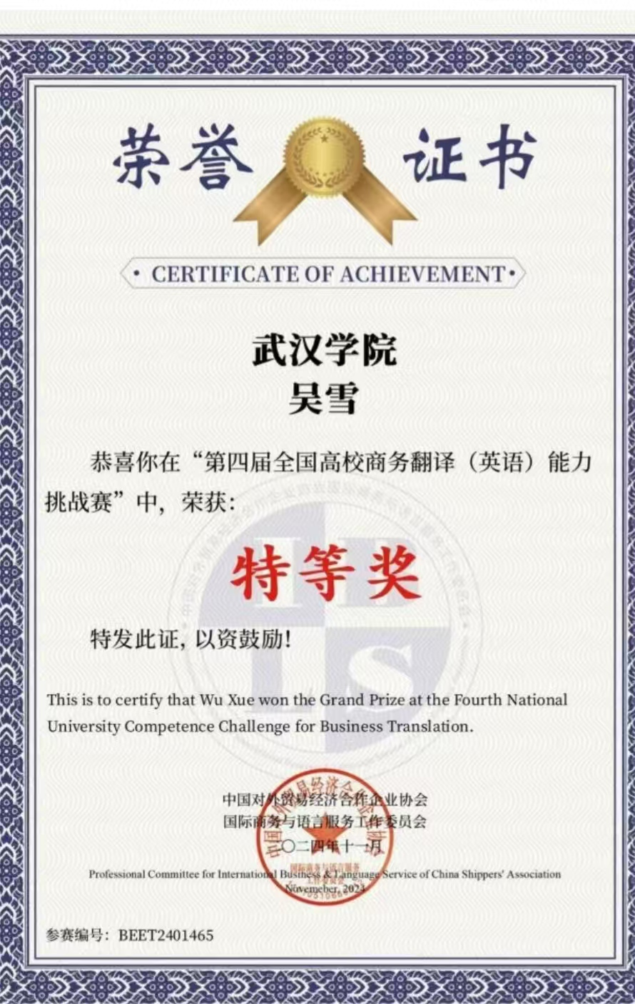 而在她的“主业”上,她也同样投入。她的书包里,建模笔记和翻译练习册常常同时存在。几年下来,她拿到了全国高校商务翻译能力挑战赛国家级特等奖、湖北省翻译大赛特等奖。2025年,她还因为综合表现优秀,获得了陈一丹奖教奖学金“优秀学生奖”。
