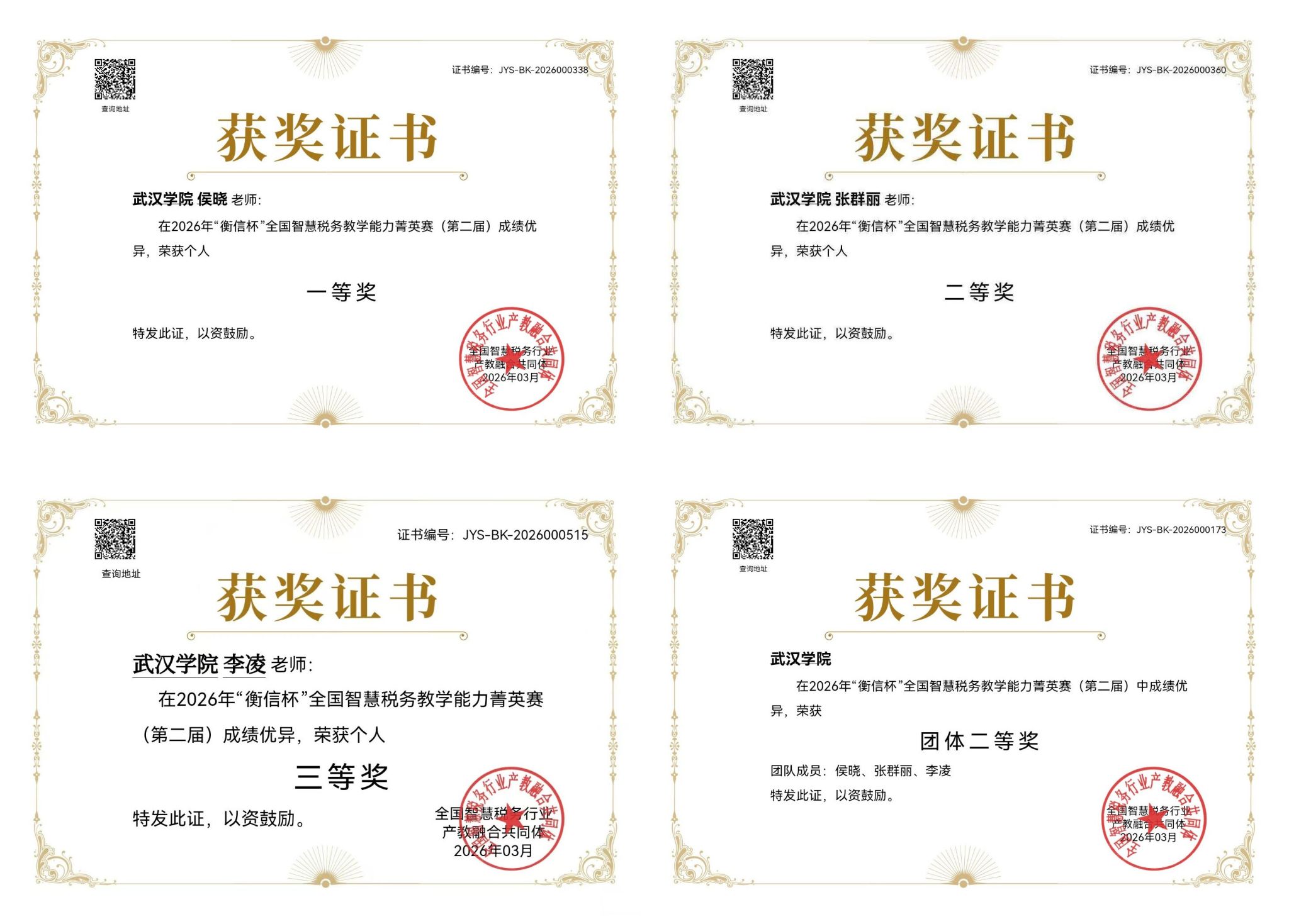 2026年“衡信杯”全国智慧税务教学能力菁英赛(第二届)近日圆满落幕。我校金融与经济学院教师侯晓、张群丽、李凌,从2000余名参赛选手中脱颖而出,分别荣获个人总分奖一等奖1项、二等奖1项、三等奖1项。同时,三位教师凭借团队整体的优异表现,荣获团队二等奖,实现个人荣誉与集体荣誉的双丰收,充分展现了我校财税专业教师扎实的专业功底与卓越的教学实践能力。