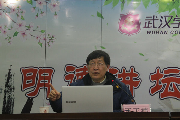 王教授为武汉学院的发展提出了自己的建议。他认为武汉学院以“武汉”为名,应该把武汉文化研究做起来,成立武汉文化研究中心,掌握武汉文化的话语权,为武汉文化培养青年精英。王教授建议同学们以先贤为榜样,从自己做起,从当下做起,努力成为时代的新贤。
