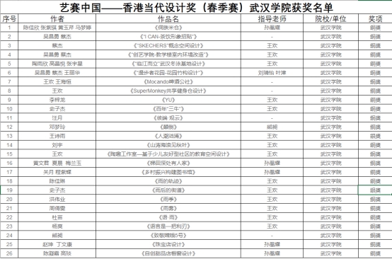 6月14日,香港当代设计奖(春季赛)评审结果揭晓,我校艺传学院师生共获得26项奖,其中来自环境设计1903班的史子杰和王诗雨分别创作的《雨后的街道》和《人潮汹涌》获银奖,还有24名师生作品获铜奖(见下表):