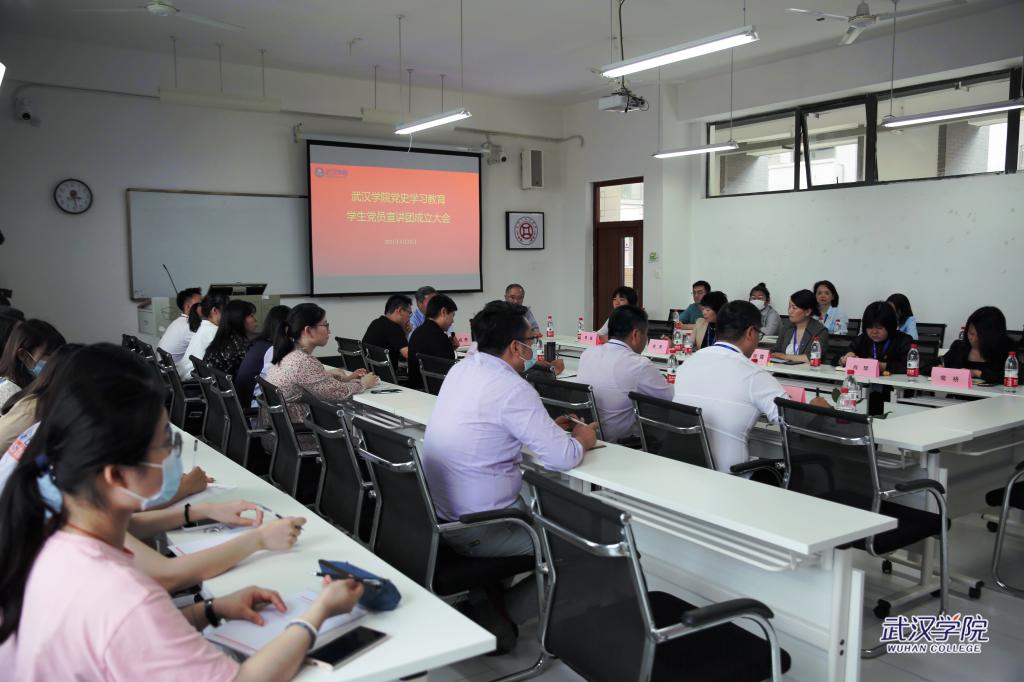 武汉学院党史学习教育学生党员宣讲团由各学院推荐的优秀学生党员代表组成,由思政课教师王利军副教授担任指导老师,学校将为宣讲团成员提供系统的培训和指导,通过专题报告会、民主生活会、主题班会、主题团日活动等形式把宣讲工作融入到学生生活中去,形成学生讲、学生学、讲学互动、以讲促学的良好局面。