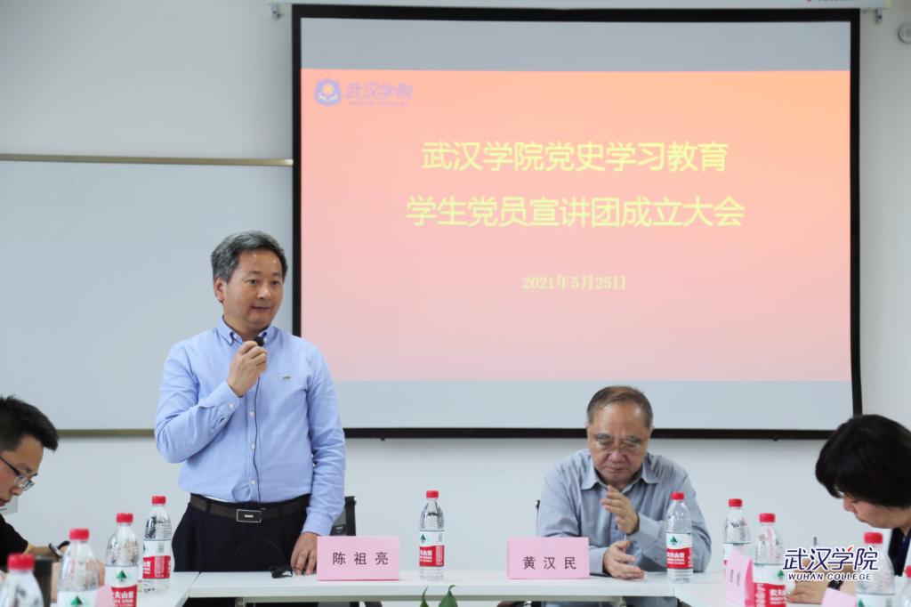 校党委书记陈祖亮教授出席宣讲团成立大会并讲话。他指出,在全党开展党史学习教育,是加强党的自身建设、推进党的自我革命、永葆党的生机活力的必然要求,党史百年,常学常新。他高度肯定了学生党员宣讲团的意义,他说,成立学生党员宣讲团,就是要以青年的视角、用青年的语言讲党史、讲理论,激发思想共鸣,呼唤价值认同,要通过宣讲团活动,锻炼提升一批党员骨干,在全校学生中推动党史学习的高潮。同时他倡议各院(部)党总支成立学院宣讲团,形成深厚的学习氛围,进一步推动党史学习教育往深里走、往实里去。