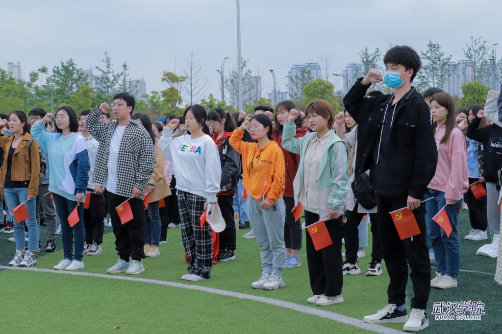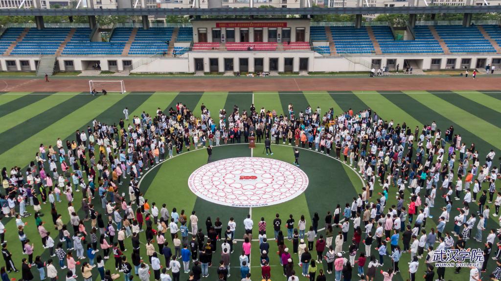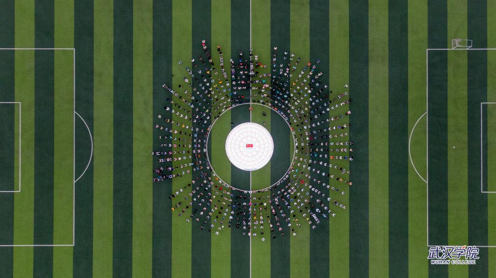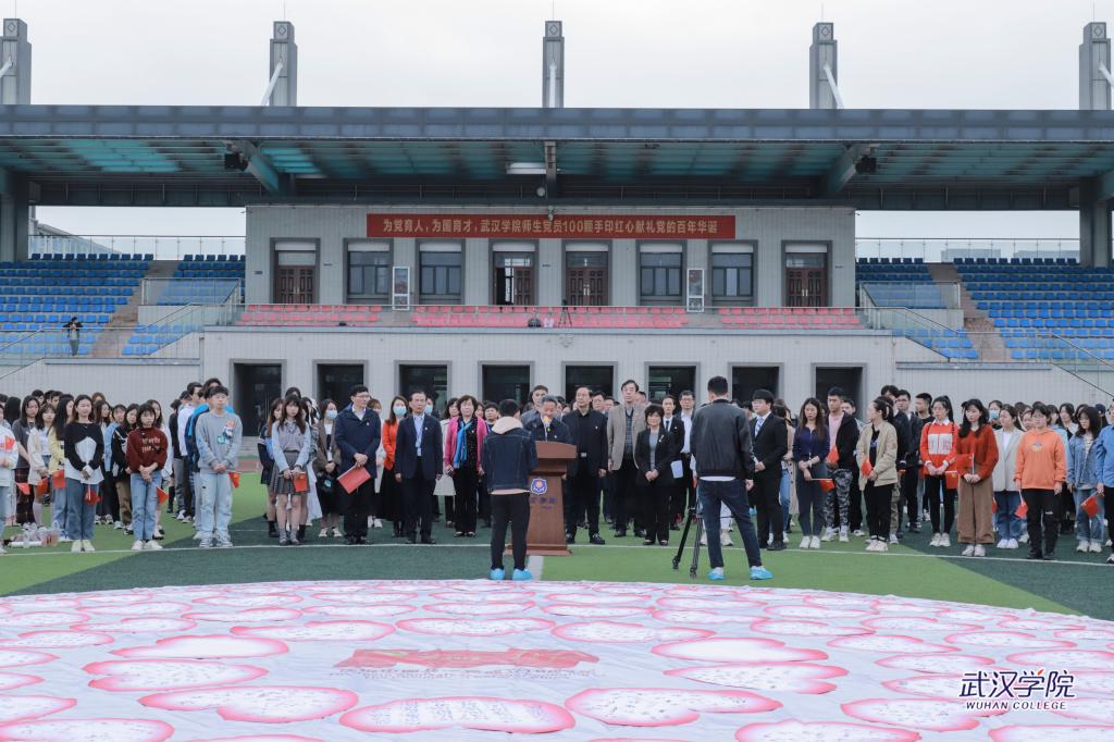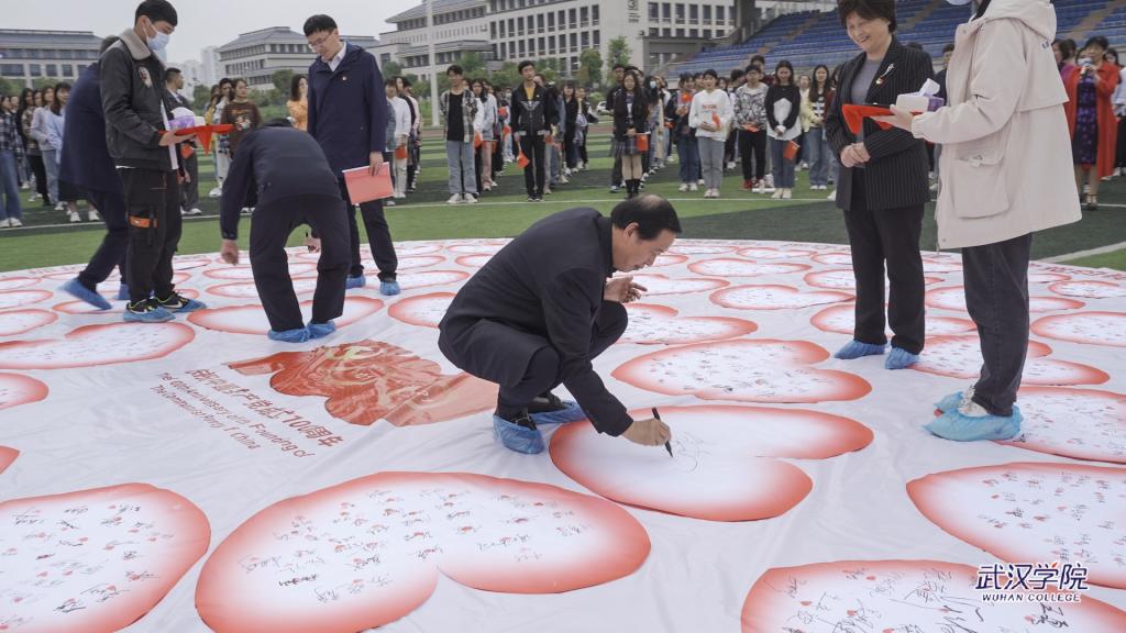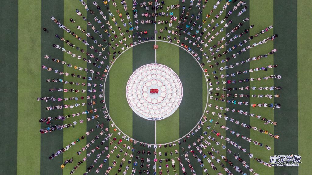 4月23日,武汉学院运动场上铺开一幅直径10米的圆形画布,全校3497名中共党员、预备党员、党员发展对象、入党积极分子用签名和手印组成100颗红心,形如花瓣环绕着党徽,献礼党的百年华诞。