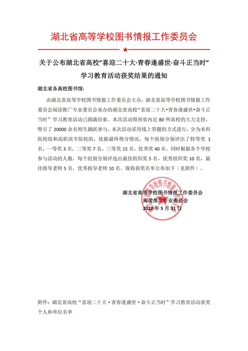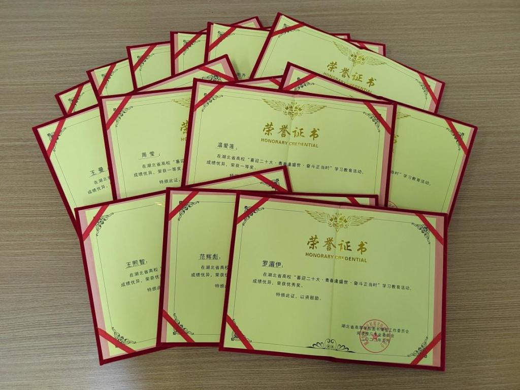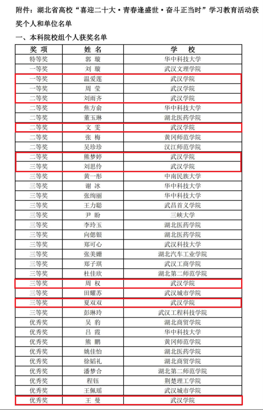 湖北省高校“喜迎二十大•青春逢盛世•奋斗正当时”学习教育活动评选结果揭晓,我校师生在本次活动中表现出色,荣获一等奖2项,二等奖3项,三等奖3项,优秀奖5项。