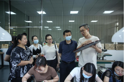 在周桂霞带领下,省教育厅一行参观了艺术与传媒学院工艺美术实验室的实操课,观摩学生通过数控、手工现场完成作品。