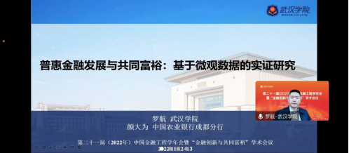 11月11日—13日,第二十一届中国金融工程学年会暨“金融创新与共同富裕”学术会议在浙江温州召开。我校副校长罗航教授作为第一作者、武汉学院为第一署名单位的论文《普惠金融发展与共同富裕:基于微观数据的实证研究》入选本次年会,罗航教授通过线上方式参加年会并作学术报告。