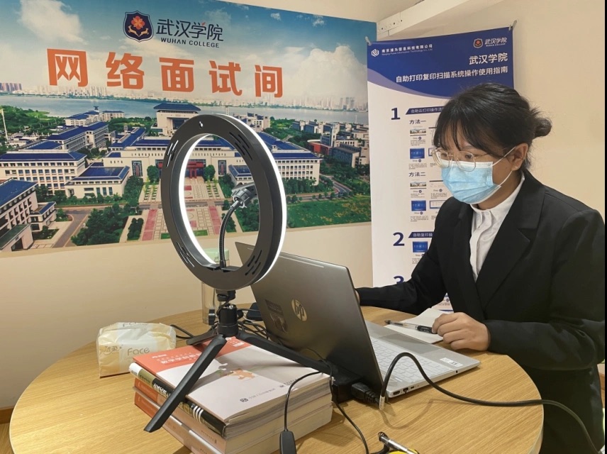 记者探访发现,面试间位于武汉学院学生事务大厅2楼,空间虽然不大,但是布置温馨,原木色的圆桌搭配绿色座椅,墙面上是校园航拍海报,更重要的是这里无线网络、手机支架、补光灯等一应俱全,可一站式解决毕业生的“云端”面试需求。