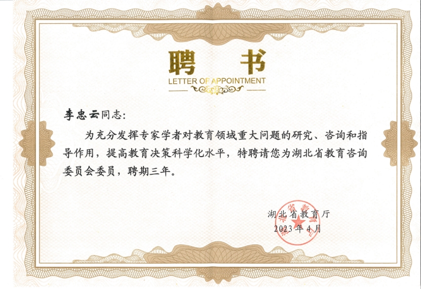 近日,从湖北省教育厅获悉,我校校长李忠云教授作为民办高校代表被聘为湖北省教育咨询委员会委员。
