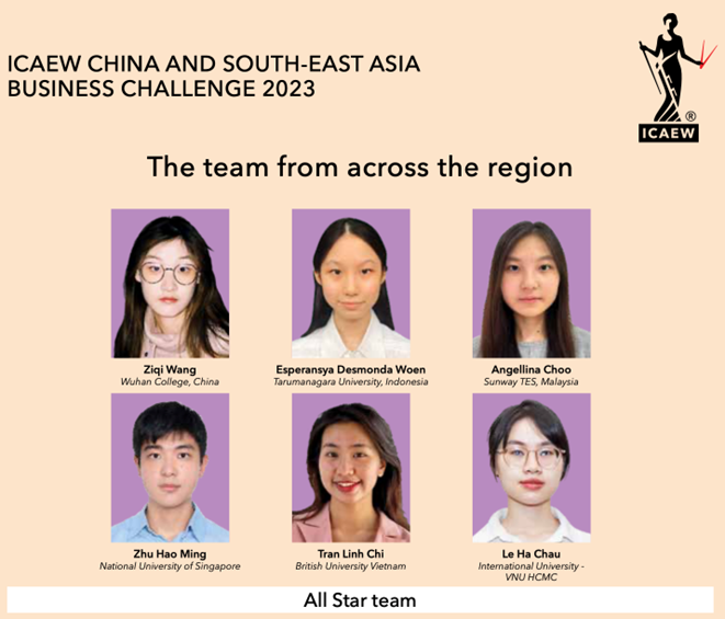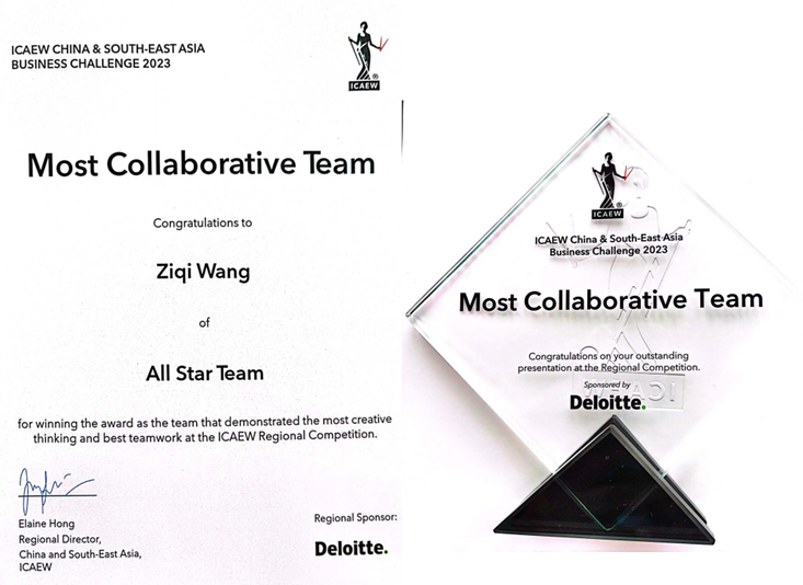 近日,ICAEW“特许新星”国际商业案例大赛中国赛区决赛圆满落下帷幕。我校会计学院ACA特色班2021级董羽吟、喻新雅、李若初、张馨怡和2020级王子琪、曹雅萱组成的“Tsia”队在决赛中表现突出,荣获中国赛区亚军。同时团队中王子琪同学获得唯一”杰出个人奖”,荣获大中华及东南亚区域赛All Star团队的参赛资格。