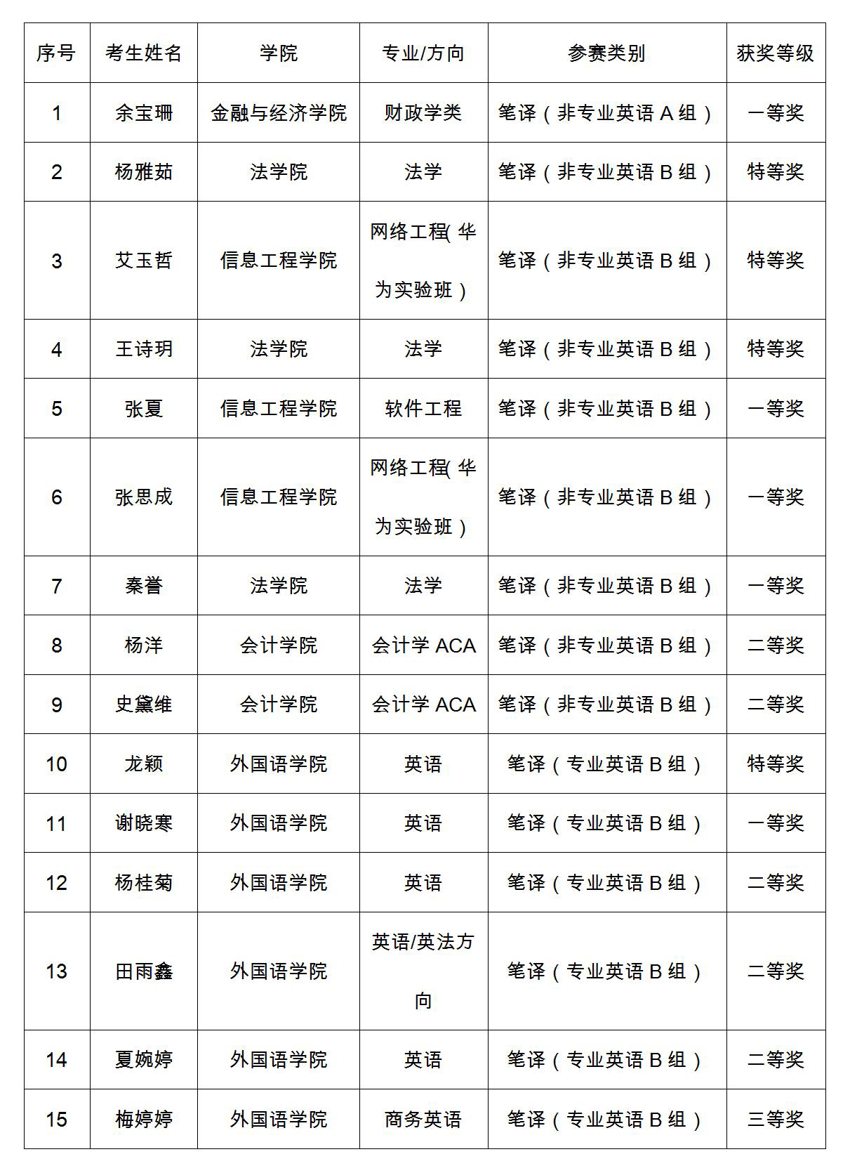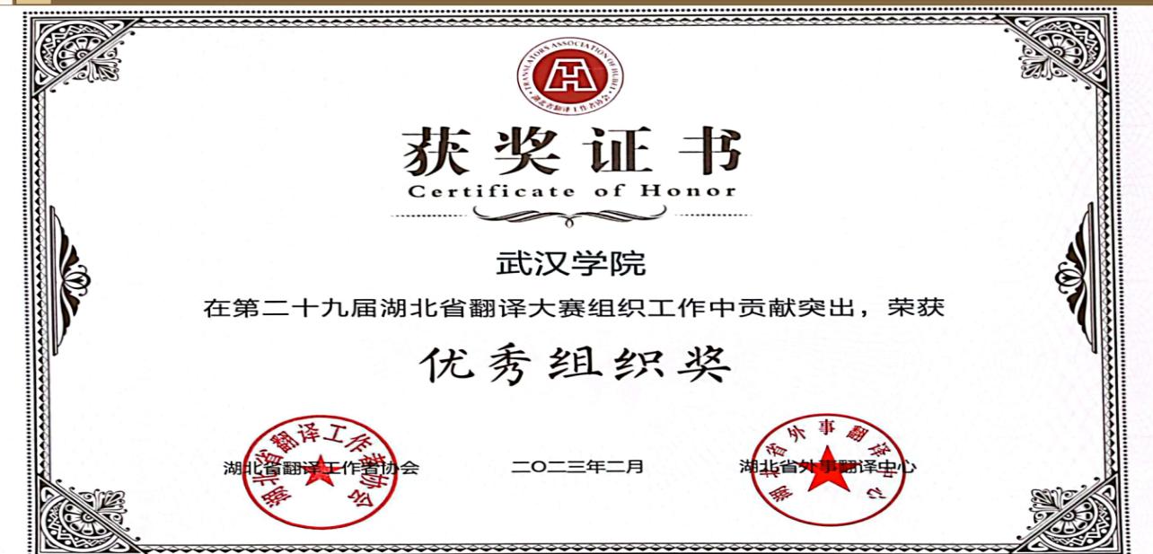 近日,第29届湖北省翻译大赛复赛结果公布,我院学子表现优异,总计74名同学进入复赛,共斩获4个特等奖、5个一等奖、5个二等奖和1个三等奖,我校荣获优秀组织奖。