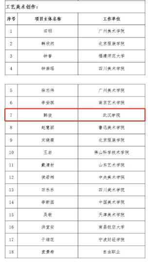 国家艺术基金于2013年由国务院批准设立,旨在繁荣艺术创作,打造和推广原创精品力作,培养艺术创作人才,推进国家艺术事业健康发展。国家艺术基金的资金主要来自中央财政拨款,受国家文化和旅游部、财政部领导和监督。此次国家艺术基金全国共申请10978项,立项资助项目703项,综合立项率约为7.8%,其中青年艺术创作人才项目综合立项率约为5.7%。韩俊老师获批项目的工艺美术创作类资助项目,全国有18人立项,湖北地区仅1人。