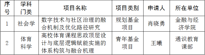 教育部2023年度人文社会科学研究一般项目评审结果近日揭晓,我校金融与经济学院教师肖晓勇申报的《数字技术与社区治理的融合机制及优化路径研究》和通识教育课部教师王曦申报的《高校体育课程思政顶层设计与底层逻辑赋能实施的体系构筑与融合机理》分别获得规划基金项目和青年基金项目立项。