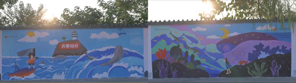 此前的8月,叶子怡、刘千慕与其他来自武汉学院的大学生志愿者前往江西省九江市湖口县——长江江豚最重要的栖息地之一,在湖口县的“鄱阳湖之夜·江豚音乐节”场地周边绘制公益墙绘,还开展了公益涂鸦墙活动,邀请当地居民一道,用艺术为乡村添砖加瓦。
