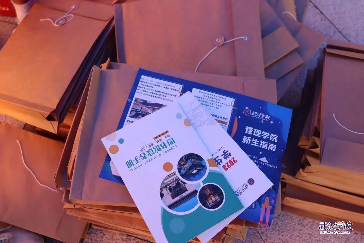 “同学,在这里领取新生专属大礼包。”管理学院在新生报到点准备了新生大礼包,其中包含《2023学生手册》《图书馆读者手册》《管理学院新生指南》。新生指南中贴心为新生标明了武汉学院校园导图、管理学院新生教育工作事历、团学联各部门介绍,各班辅导员、班主任、朋辈导师信息等内容,初次见面,十分贴心。