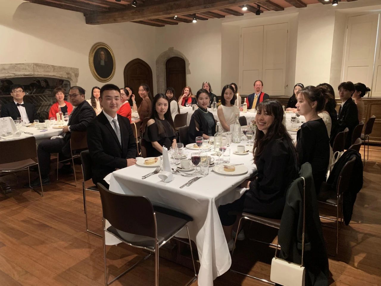 7月6日晚,访学团参与了耶稣学院举行的晚宴。晚宴上大家全体正装出席,体验英国的宴会文化。同时,这次晚宴也邀请到了在剑桥的中国学生和访学团进行交流,其中有一丹奖基金会驻剑桥的代表张芮嘉女士。大家在晚宴上互相交谈,分享不同的人生经历。这次晚宴让访学团体会到了异国风情,并获得了与剑桥学生交流的机会。大家在参加晚宴后仍意犹未尽,纷纷与剑桥学生们合影留念。