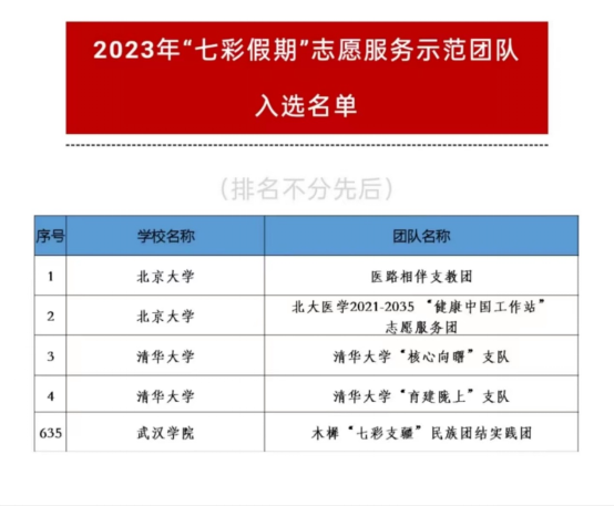 2023年团中央“七彩假期”志愿服务示范团队入选名单