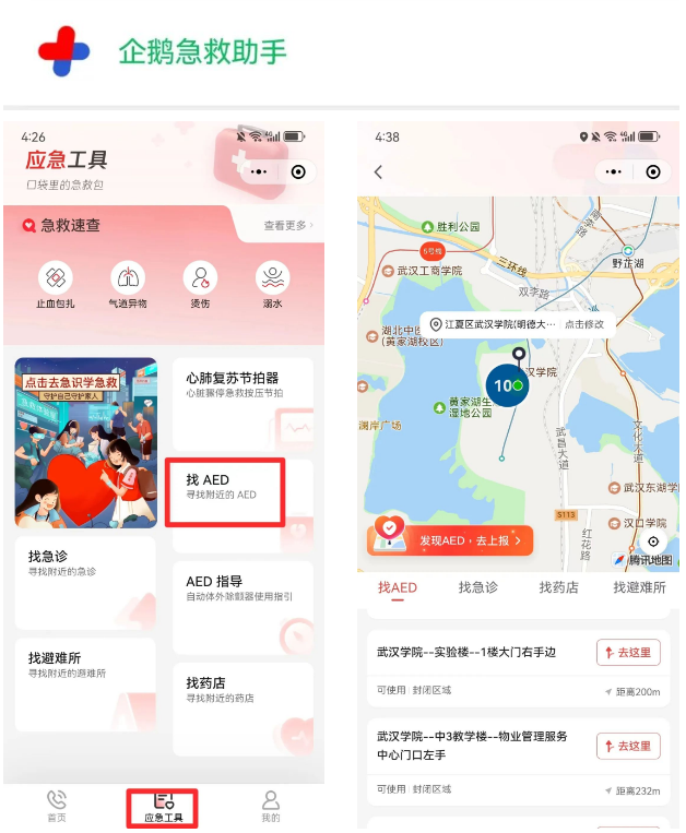 目前,15台AED已被安装在体育场、图书馆、食堂、教学楼、行政楼等场所,根据校园面积和布局,保证500米范围内就有一台AED设备。同时,所有AED设备及参加培训的300名持证急救员信息均被纳入由腾讯公司开发的应急响应系统,通过“企鹅急救助手”小程序就能查看就近的AED设备位置,同时系统还能向附近的持证急救人员发出求救信息。