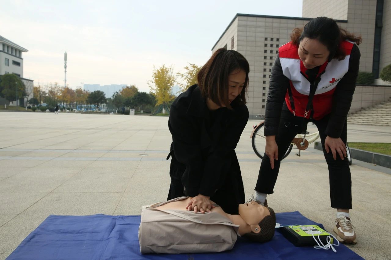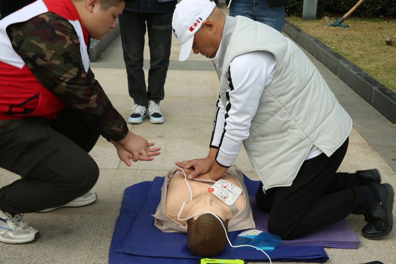 “这里有人晕倒了,我是红十字会救护人员,请这位先生帮我拨打120并回复,请这位女士帮忙寻找附近的AED……”培训现场,红十字会工作人员向学员详细讲解和演示了急救程序。“设备已开机、请贴好电极片、正在分析请不要靠近病人、准备放电请不要触摸病人……”模拟急救环节,每一位学员都在老师的指导下模拟实操了心肺复苏体外按压和AED的使用。