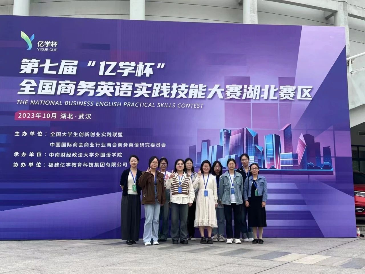 彭倩(前排右三)参加“亿学杯”商务英语实践技能大赛