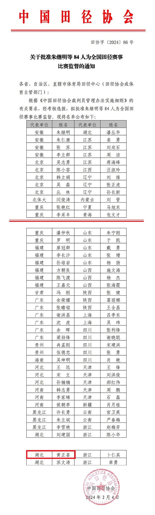 全国田径赛事比赛监督入选人员名单近日揭晓,84人顺利通过考核,成为首批田径赛事比赛监督。我校通识教育课部教师黄正喜光荣入选。