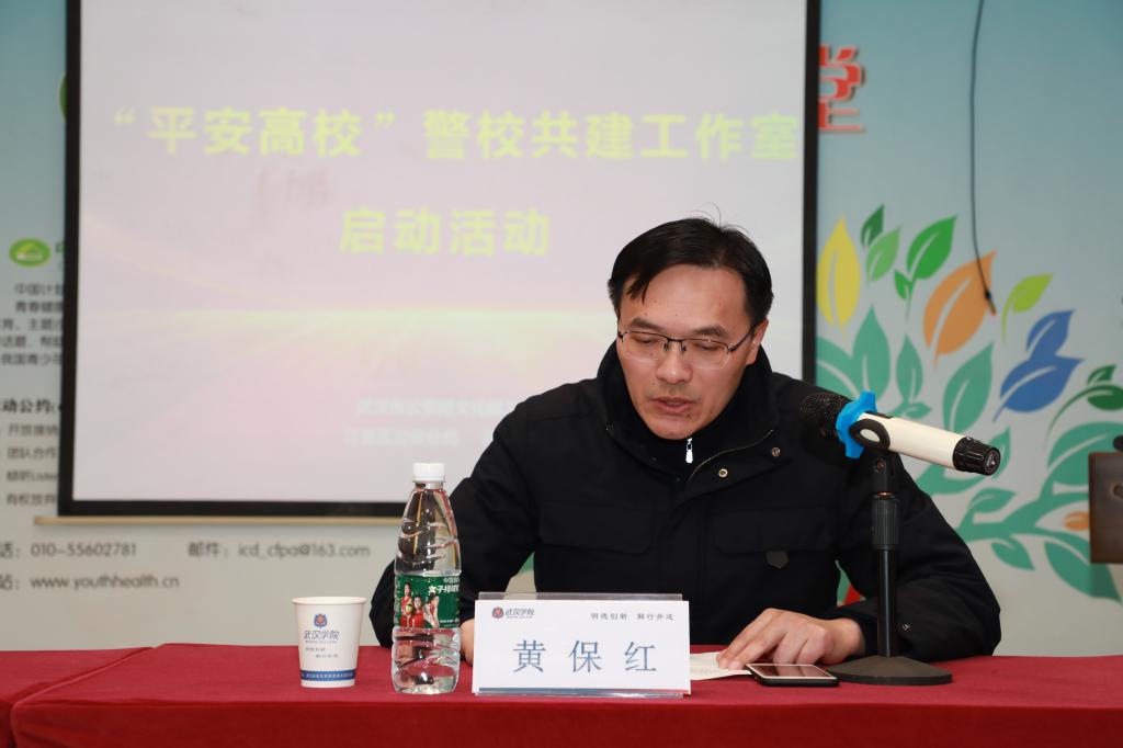黄保红代表学校对工作室的成立表示热烈祝贺,向一直关心支持学校发展的武汉市公安局文化保卫局表示诚挚感谢。他说,工作室的成立是学校深入贯彻平安校园创建精神,积极探索新时代“枫桥经验”,着力打造“警校融合共治”新格局,全面构建警校共建共治新模式的成果,标志着我校平安校园建设工作迈上新台阶。他表示,学校下一步将持续推进警校联动机制建设,全力保障工作室高效有序运行,深化警校“平安共建”协同合作,加强舆论引导、安全教育、风险预警、应急处突协同共治,将工作室打造成为“警校融合共治、共筑校园平安”的武院样板,为学校创造更加安全、文明、和谐、稳定的育人环境,为“平安武汉”建设做出新的更大贡献。