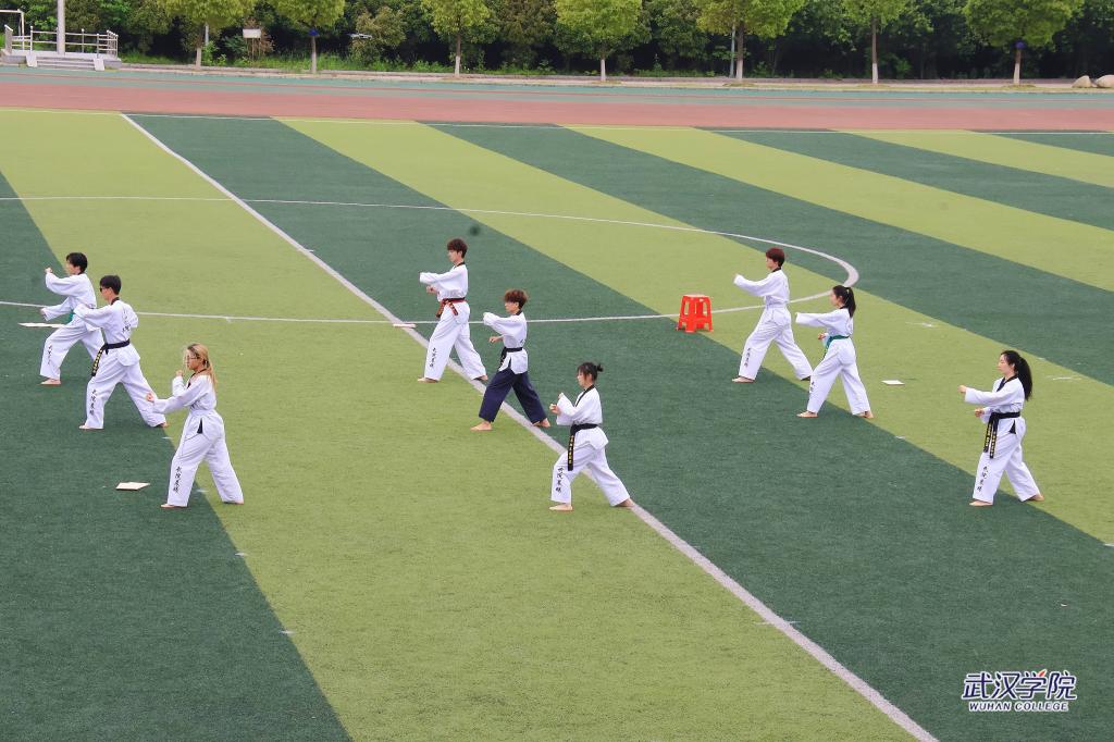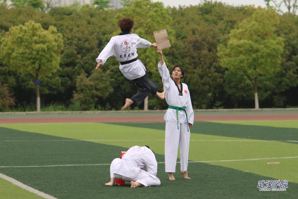 校跆拳道社的同学们带来的跆拳道表演,步伐坚定有力,沉稳自信。他们的每一个动作都刚劲有力,一块块坚硬木板在他们过硬的技术下全部粉碎,带给观众视觉震撼。